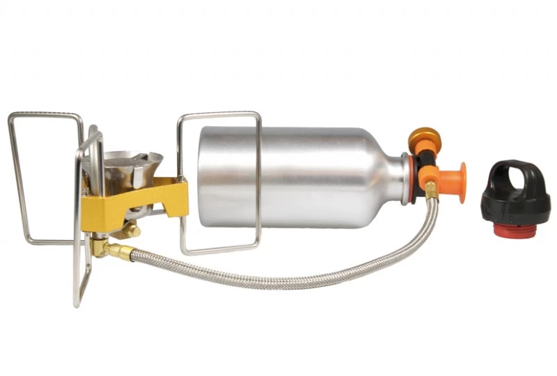 Ein leistungsstarker Benzinkocher (Reinbenzin bevorzugt, oder Autobenzin) mit sehr niedrigem Gewicht. Kann auch mit Kerosin betrieben werden (Petroleum).