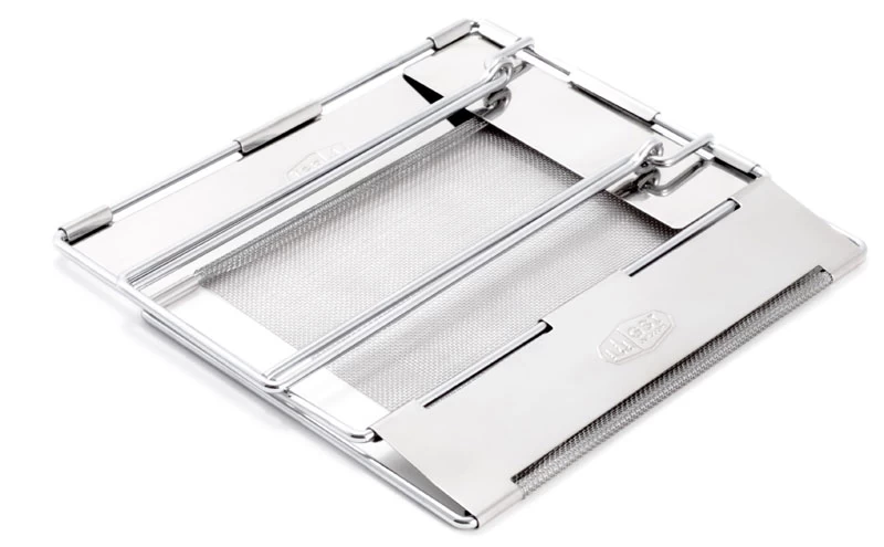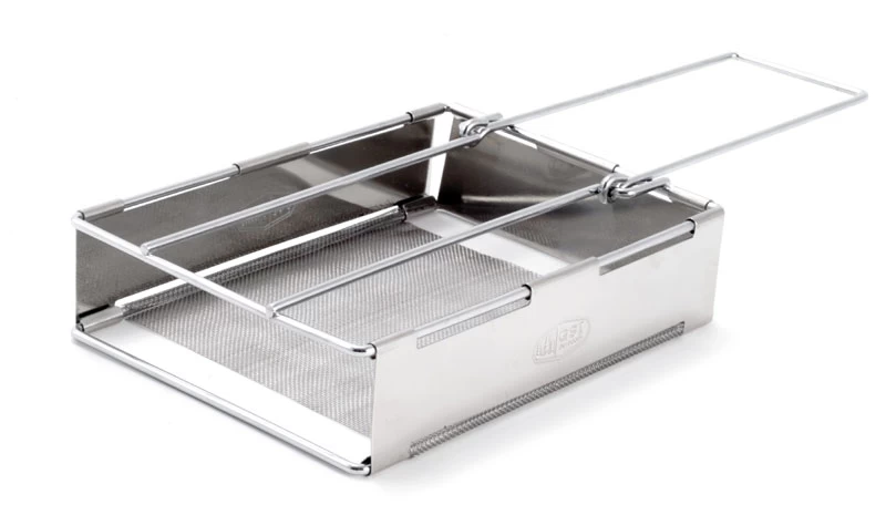 Ein in sich zusammen klappbarer Toast-Aufsatz in ansprechender Optik für optionale Gaskocher oder offene Feuer.