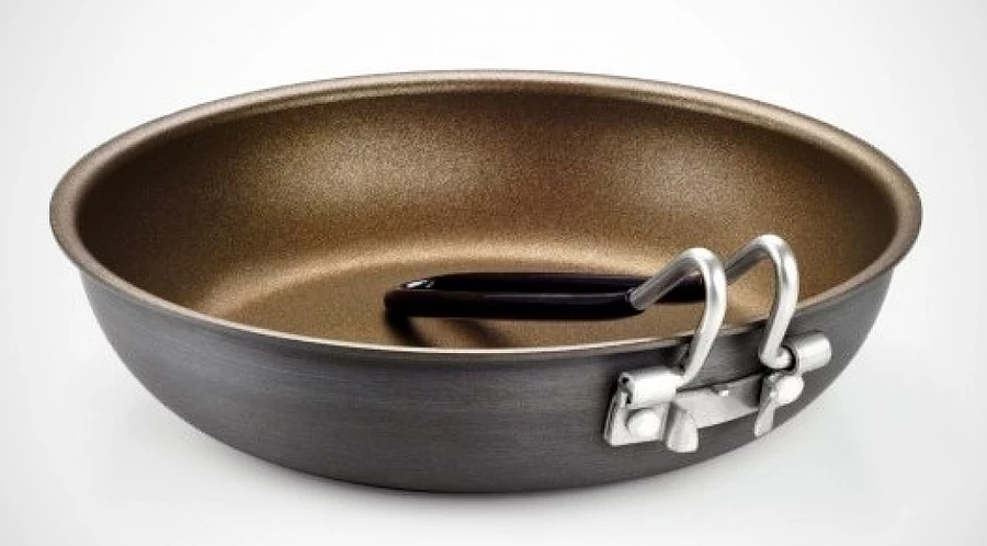Eine klein verpackbare Pfanne aus Hart Anodisiertem Aluminium mit Teflon Radiance anti-Haft-Beschichtung. Das HA-Alu soll eine härtere Oberfläche als Edelstahl haben (sagt der Hersteller), die Teflon Radiance -Beschichtung soll deutlich kratzresistenter und besser Hitze-verteilend sein als das normale Teflon.