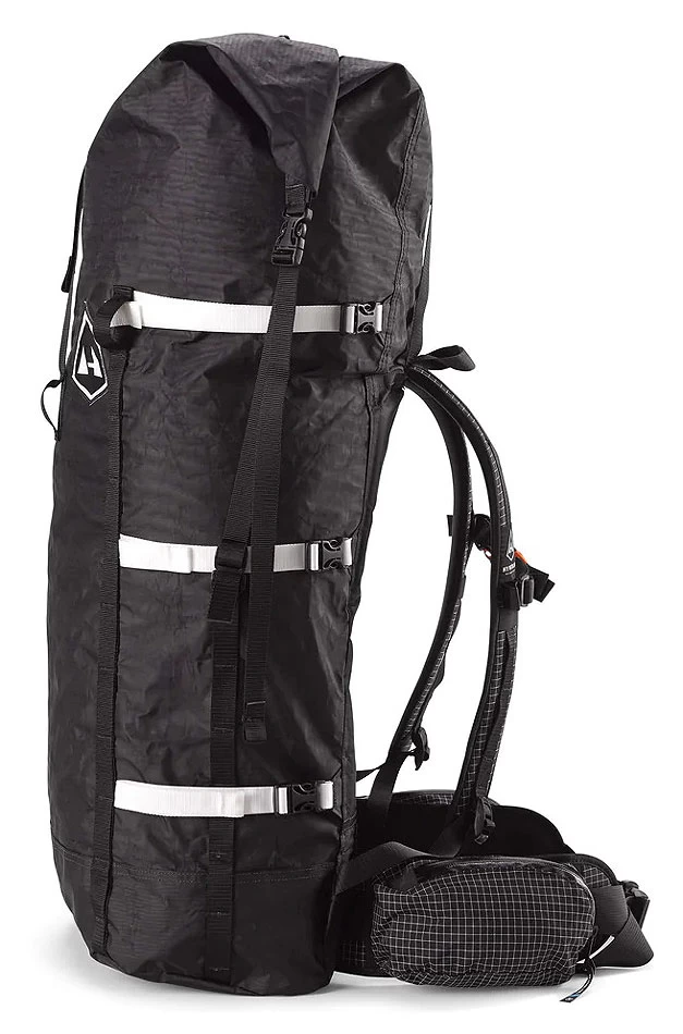 - Roll-Top-Verschluss für flexible Beladung, kann so weit heruntergrollt werden bis das Ende des Rückentragegestells erreicht ist, wenn nicht das volle Volumen genutzt wird. Die oberen Kompressionsriemen können abgenommen werden. Wenn sie angebracht sind kann Ausrüstung damit zusätzlich fixiert werden