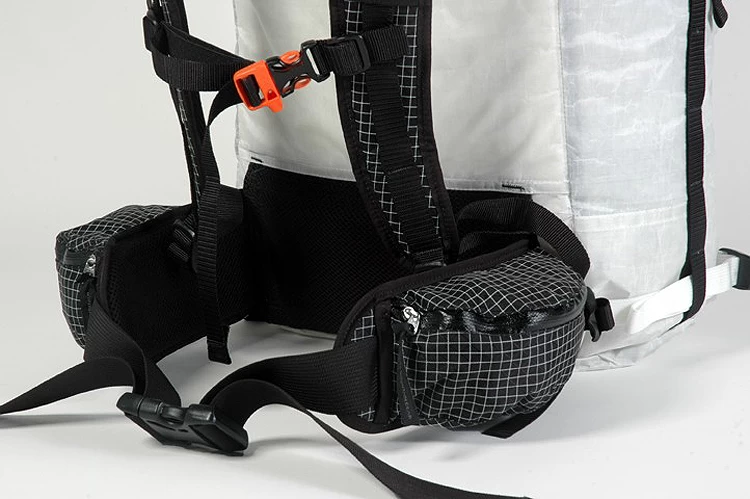 - Gut und nicht zu weich gepolsterter Hüftgurt mit 38mm Gurtband und Riegelschlaufen im Abstand von ca. je 40 mm zur Anhängen von Karabinern oder sonstigem Kleinkram