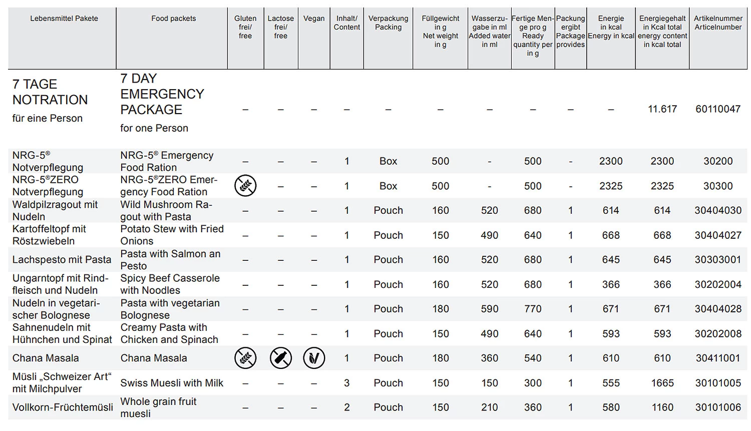 Die Notnahrung kommt in einem wiederverschliessbaren und stapelfähigen Behälter mit Tragehenkel.