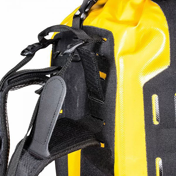 Das Gear-Pack lässt sich auseinander nehmen und voll verstellen. So kann man die Rückenlänge anpassen, die Rückenplatte entnehmen und den Hüftgurt, sogar das ganze Tragesystem abnehmen. In der einfachsten Form ist das Gear-Pack ein klassicher Ortlieb Packsack mit Rollverschluss. Zusätzlich ist der Rucksack mit diversen Befestigungsmöglichkeiten versehen, sodass man noch einiges an Ausrüstung von außen befestigen kann – oder vorhandene Außentaschen individuell anders anbringen kann.