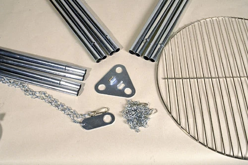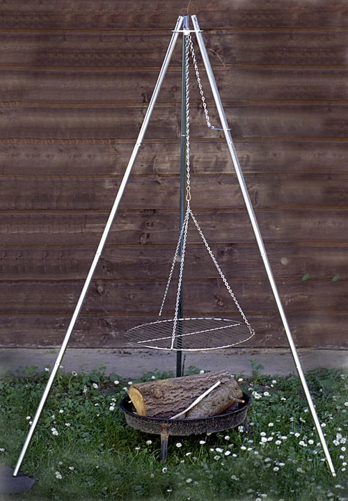 Dreibeine erlauben vielfältige Anwendungsmöglichkeiten. Gleichgültig, ob Sie den Gruppentopf oder einen Wassersack aufhängen wollen, den Grillrost übers Feuer bringen oder die Laterne in passender Höhe plazieren möchten. Stabil, sicher und klein für den Transport. Die 4-teiligen Stangen sind mit Gummikordel verbunden und dadurch schnell und sicher auf- und abgebaut. Eine vernickelte Kette mit zwei S-Haken sorgt für die Höhenverstellung. Verchromter Grillrost mit 43,2 cm Durchmesser. Gute Qualität für hohe Beanspruchung. Galvanisiertes Stahlgestänge komplett mit Kette und Grillrost.