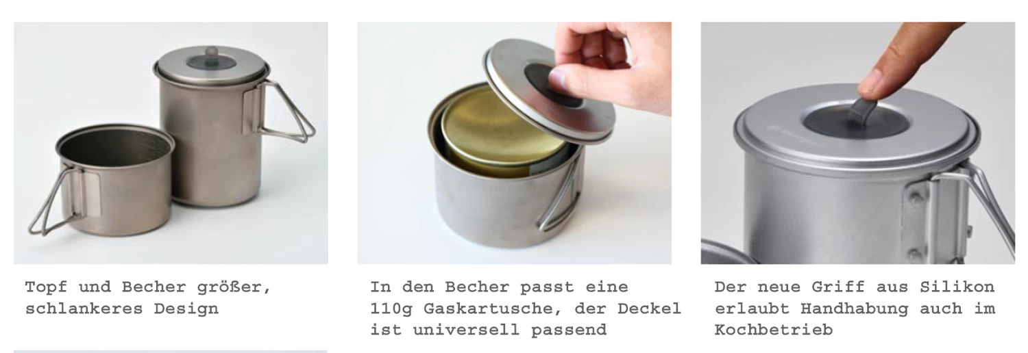 Für alle Ultraleicht-Backpacker: Ultraleichter Titantopf mit Klappgriffen und Deckel sowie eine Tasse mit Klappgriffen und eingestanzter Skala. 2017 überarbeitet (daher das „R“ für „revised“ in der Artikelnummer): größerer Topf, größerer Becher, neuer Deckelgriff. Mehr Möglichkeiten, praktikablere Maße, kaum schwerer als früher.