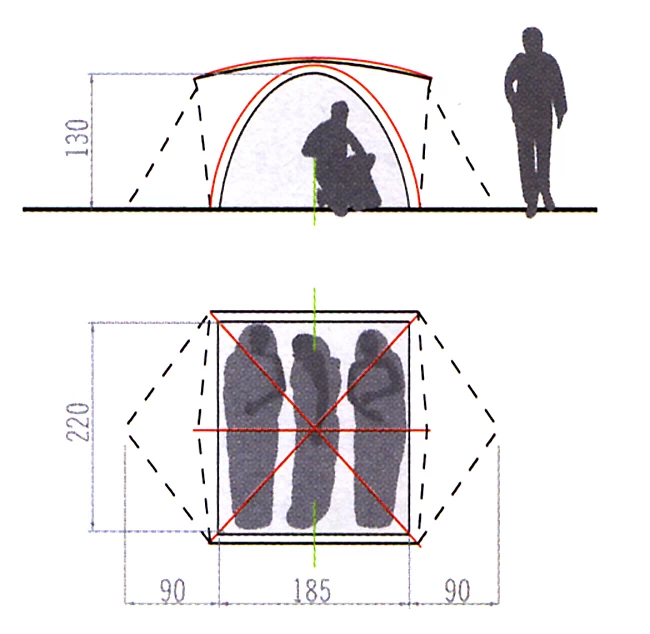 - Maße – sehen Sie bitte das Detailbild. Grundfläche des Innenzeltes ca. 4.1m2, Aufbaufläche gesamt ca. 6.6m2